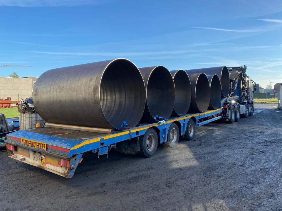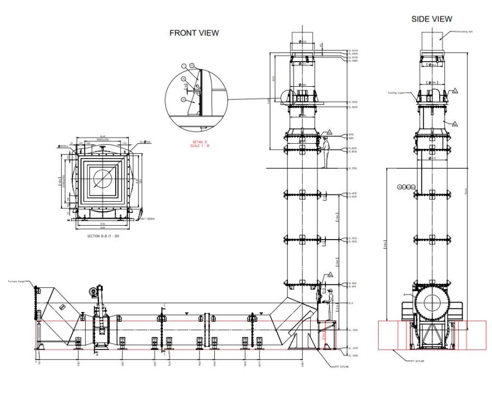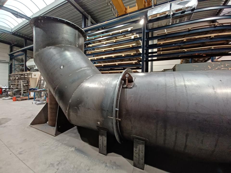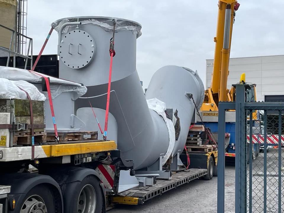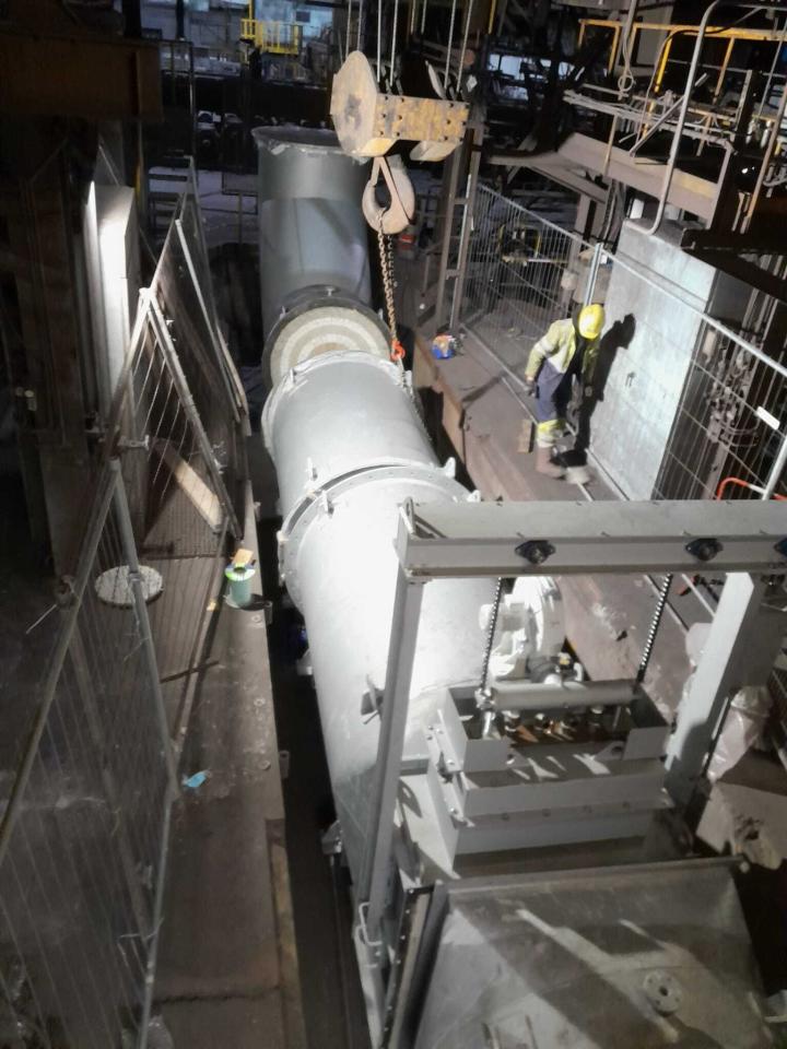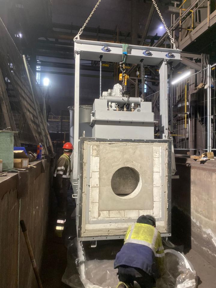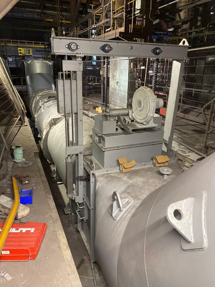 Bij de pit naverwarmingsoven hebben we rookgaskanalen geïnstalleerd die zich over 15 meter horizontaal en 15 meter verticaal uitstrekken. Deze kanalen hebben een binnendiameter van 500 mm en een buitendiameter van 1350 mm, en zijn bekleed met vuurvaste stenen. Ze zijn ontworpen om een proces temperatuur van +1300°C aan te kunnen, terwijl de buitentemperatuur slechts +50°C bedraagt. Een bijzondere uitdaging was de precisie die vereist was voor de aansluiting; er was een tolerantie van slechts 3 cm tussen de flens van de oven en de aansluiting van de bestaande schoorsteen. De gehele installatie is zorgvuldig gepland en uitgevoerd, waarbij de geprefabriceerde stukken, elk tussen de 4 en 8 ton, nauwkeurig op hun plaats werden gebracht binnen een bestaande metalen structuur. Een belangrijk onderdeel van dit systeem is de luchtgekoelde rookgas guillotine demper met vuurvaste bekleding. Deze wordt bestuurd door een elektro-pneumatische actuator die werkt op een 4-20 mA signaal. Het belangrijkste doel van deze demper is het reguleren van de onderdruk in de oven, waarbij het zich richt op een waarde van -10mbar. De temperaturen waarvoor deze demper is ontworpen zijn indrukwekkend, met een maximale temperatuur van 1300°C en een nominale waarde van 1100°C. Dit gehele project werd door ons team sleutelklaar opgeleverd, van het initiële concept tot de uiteindelijke installatie.
